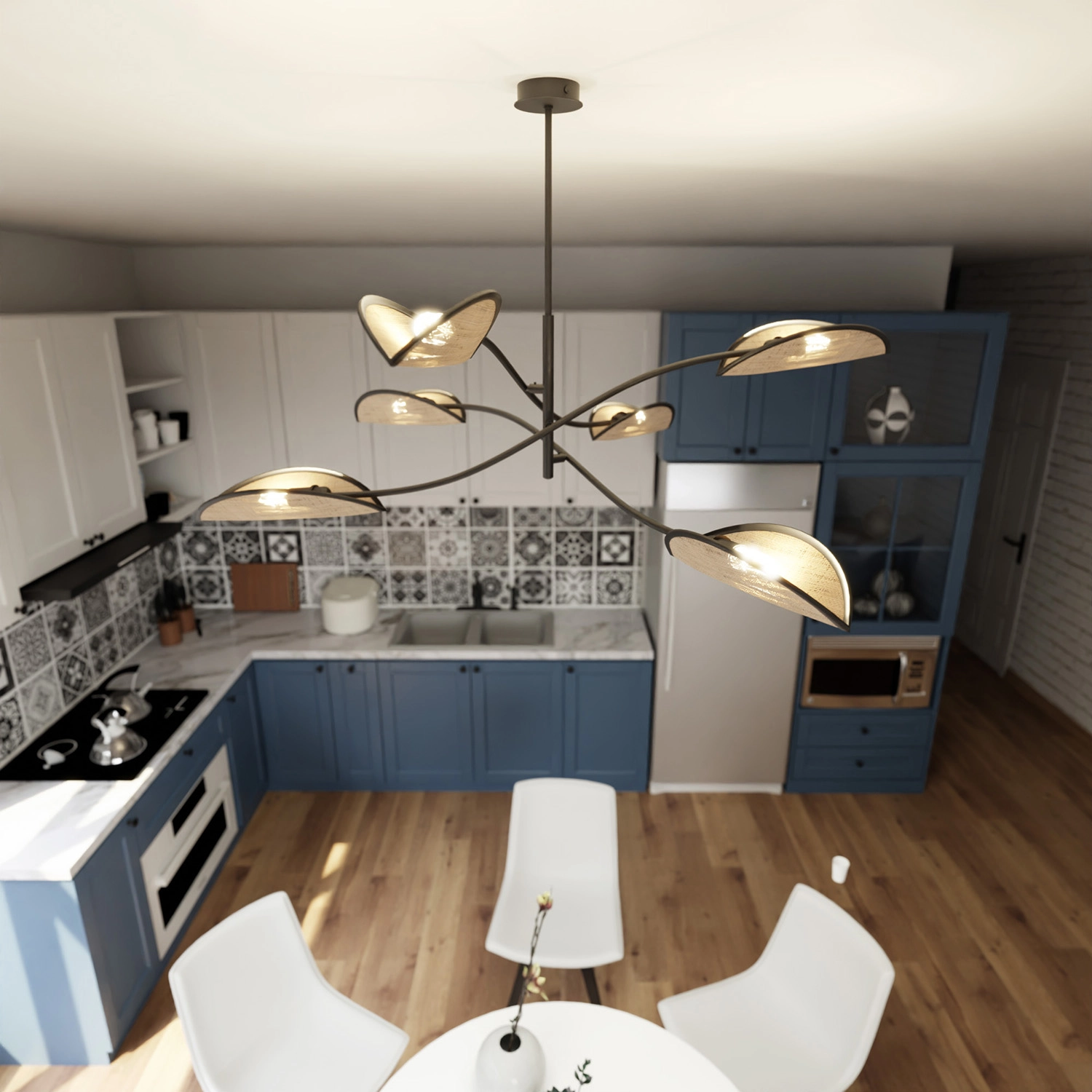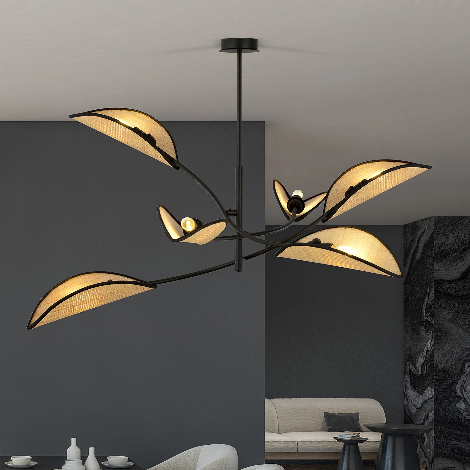 Sospensione realizzata con base in metallo di colore nero e bracci mobili con 6 diffusori originali in rattan naturale. Si adatta perfettamente ai gusti dei clienti che apprezzano materiali unici e un design originale di ispirazione etnica. Gli eccezionali paralumi a forma di foglia aggiungono una straordinaria delicatezza alla lampada. La lampada da soffitto LOTUS riscalderà perfettamente l'interno della tua casa, creando un'atmosfera accogliente. Sta meglio in soggiorno o in camera da letto e attirerà sicuramente l'attenzione di tutti gli ospiti. I paralumi aperti illuminano efficacemente la stanza, creando un'atmosfera unica. Realizzato con materiali di altissima qualità.