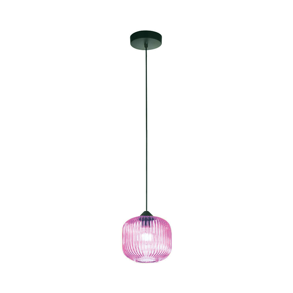 Sospensione con struttura in ferro laccato nero con cavo elettrico regolabile e diffusore in vetro soffiato rosa con rigatura in rilievo 1 luce . Prodotto 100% Made in Italy