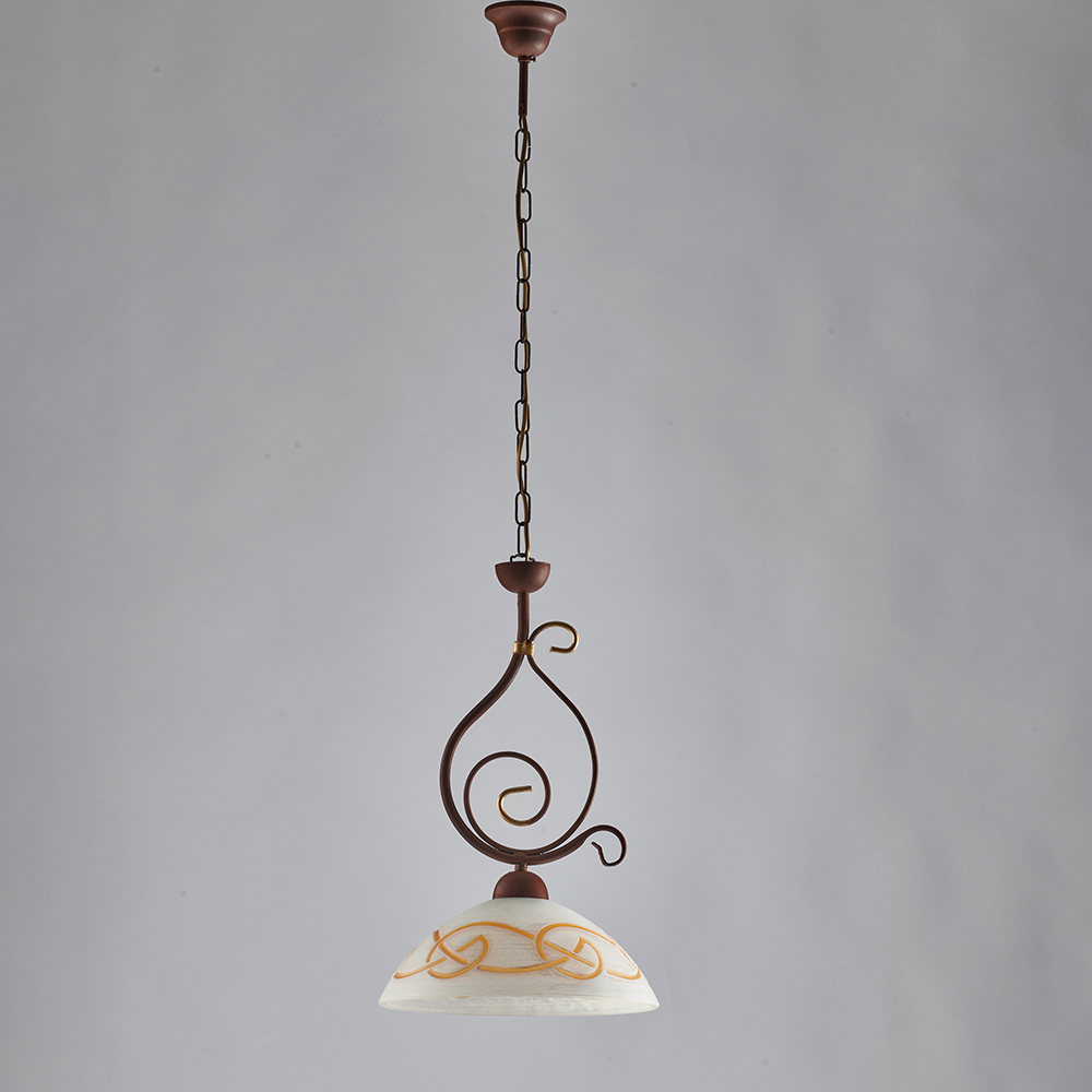Sospensione 1 luce realizzata artigianalmente in ferro battuto forgiato a mano.. Laccata con pittura termoindurente color nero con decorazione ruggine e rifiniture oro. Si completa con un diffusore di vetro centrifugato diam.30 cm color sabbia e decori ambra. In base alle diverse esigenze è possibile modificare l'altezza del lampadario grazie alla catena regolabile, rendendo questa sospensione adattabile a tutti gli spazi. La linea Faraone risulta particolarmente adatta in ambienti rustici, con travi scure in legno e pavimento in cotto, perfetta per arredaredallo stile imponente, case di campagne, taverne, ristoranti ed ambienti rustici in generale. Disponibile anche nella versione avorio e oro.