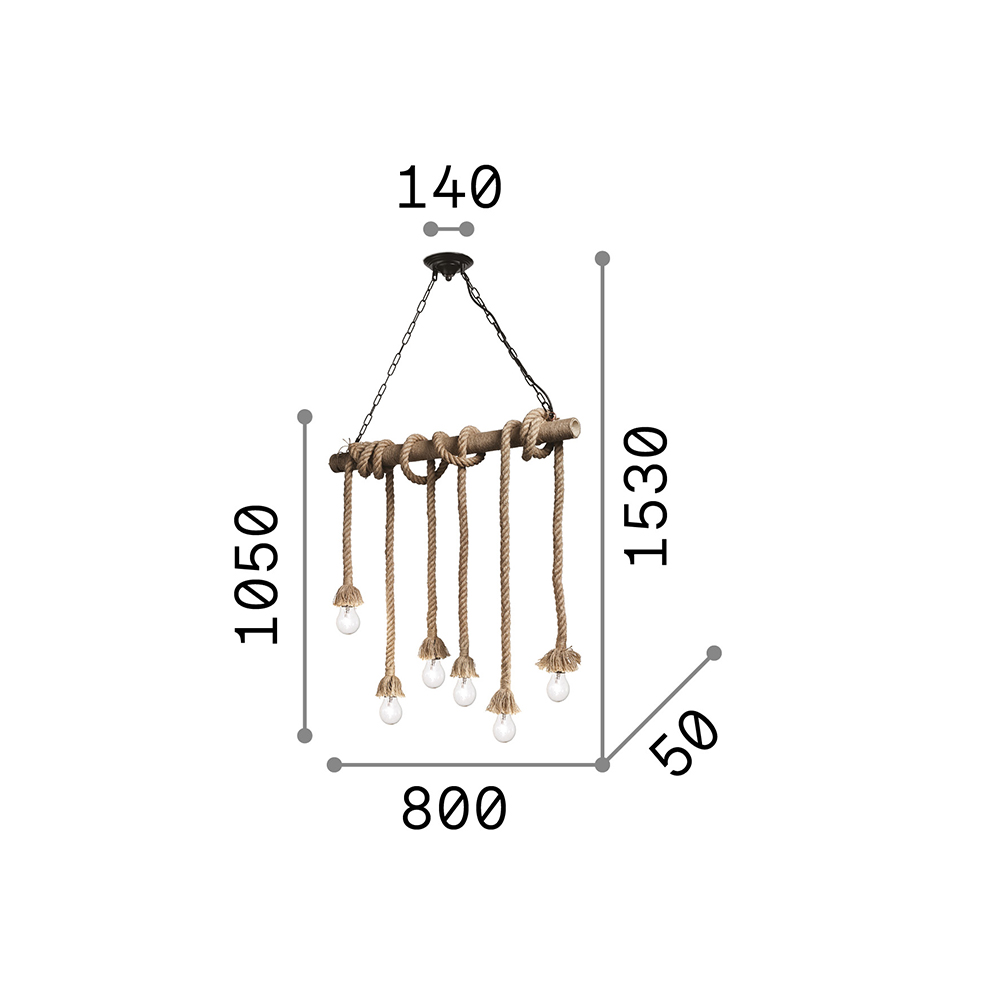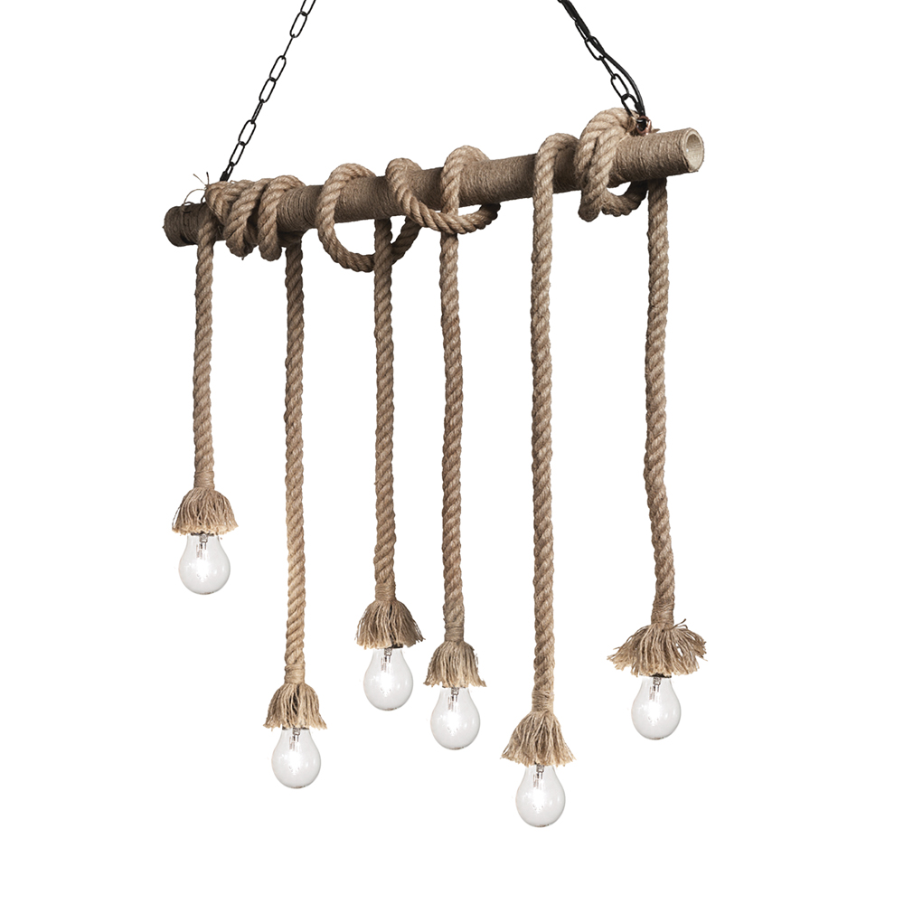 Collezione CANAPAORIGINALI SOSPENSION IN CANAPAOriginalissima sospensione a 6 luci con montature metalliche e cavi elettrici rivestiti interamente in corda di canapa..