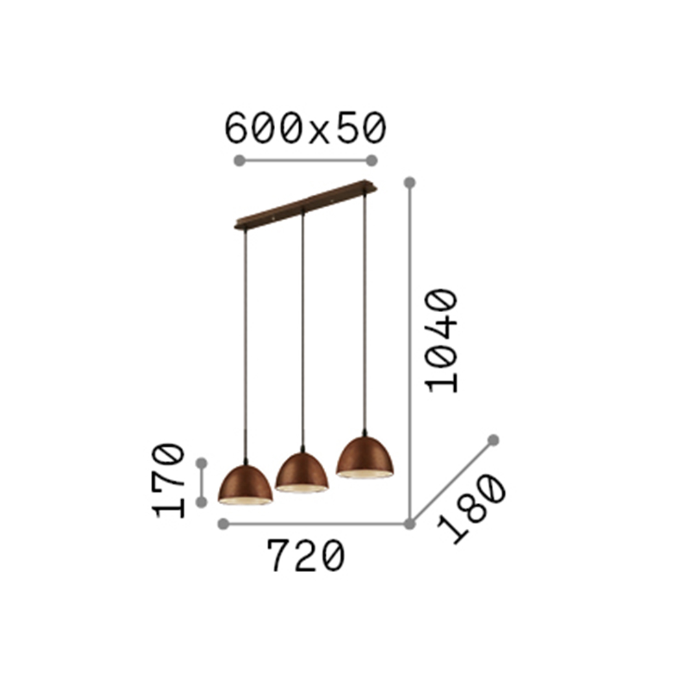 Collezione FOLKEFFETTO OSSIDATOSospensione a 3 luci con diffusore in metallo decorato con effetto ossidato. Parabola interna ondulata e smaltata bianca. Cavo in tess..