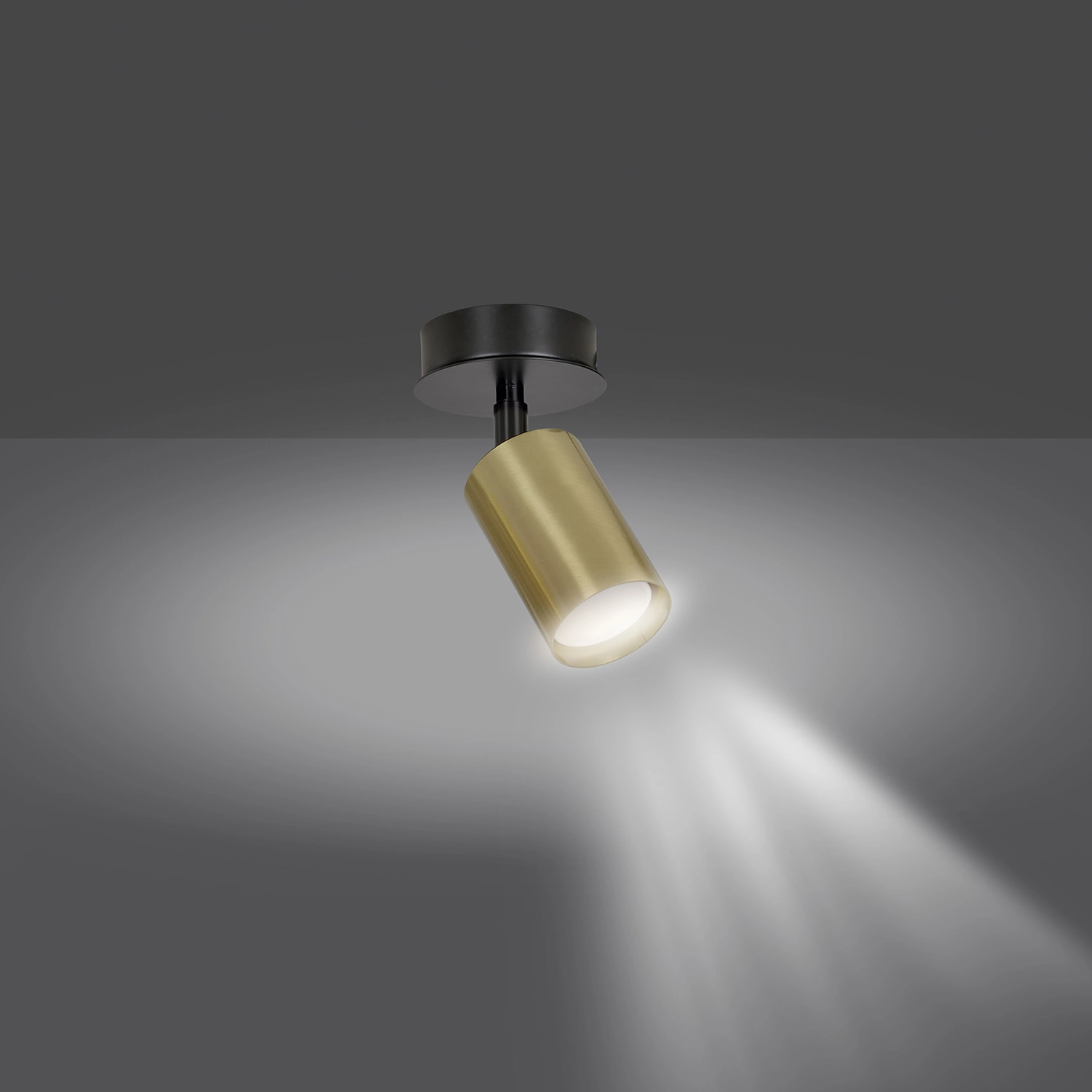 Lampada spot moderna a 1 luce realizzata con base in metallo di colore nero con braccio e paralume cilindrico regolabile in metallo di colore oro. Le lampade si distinguono per il design e la forma semplici che si adattano perfettamente a qualsiasi disposizione. La luce focalizzata e direzionale li rende ideali come illuminazione aggiuntiva sopra il bancone della cucina, in un corridoio o accanto a un comodino.