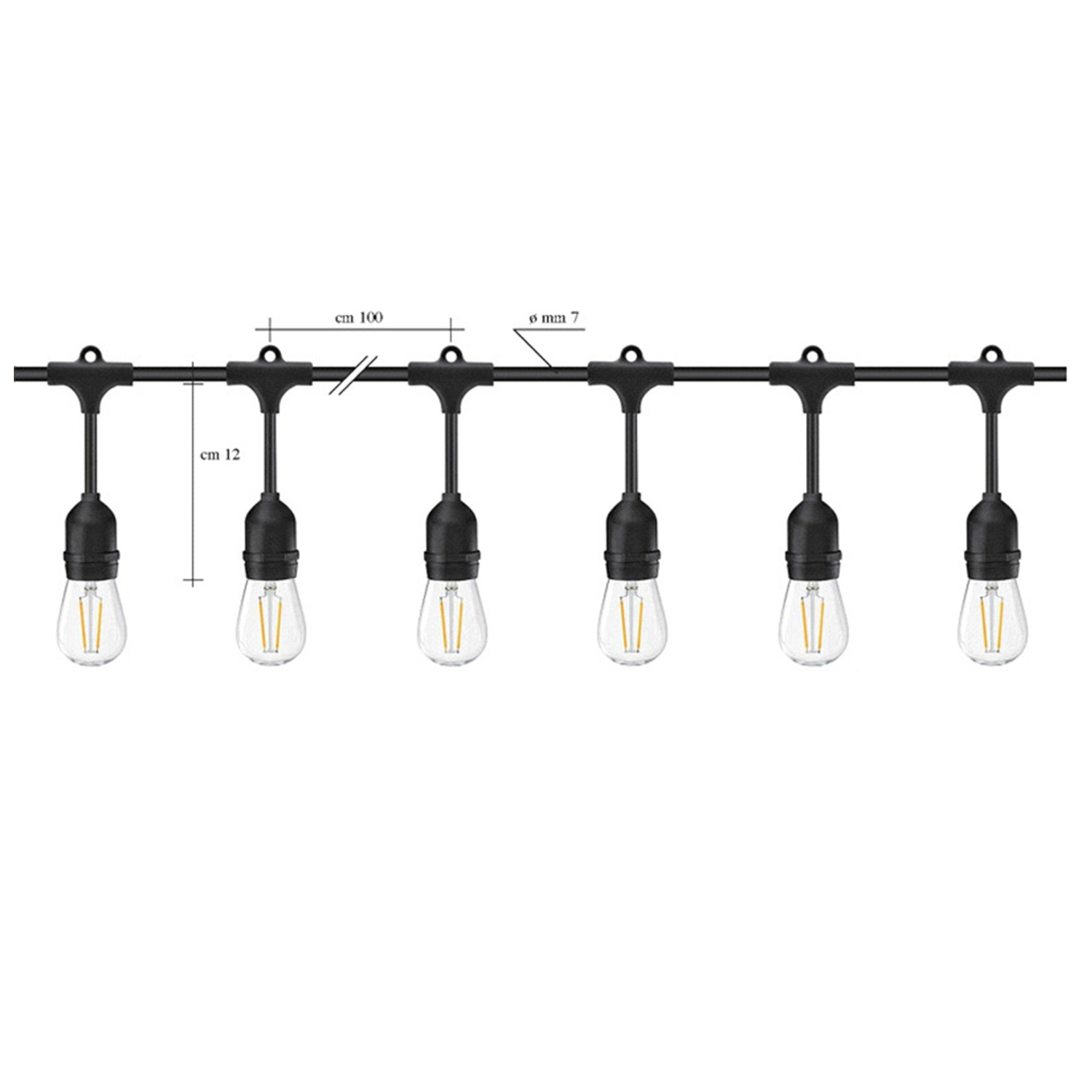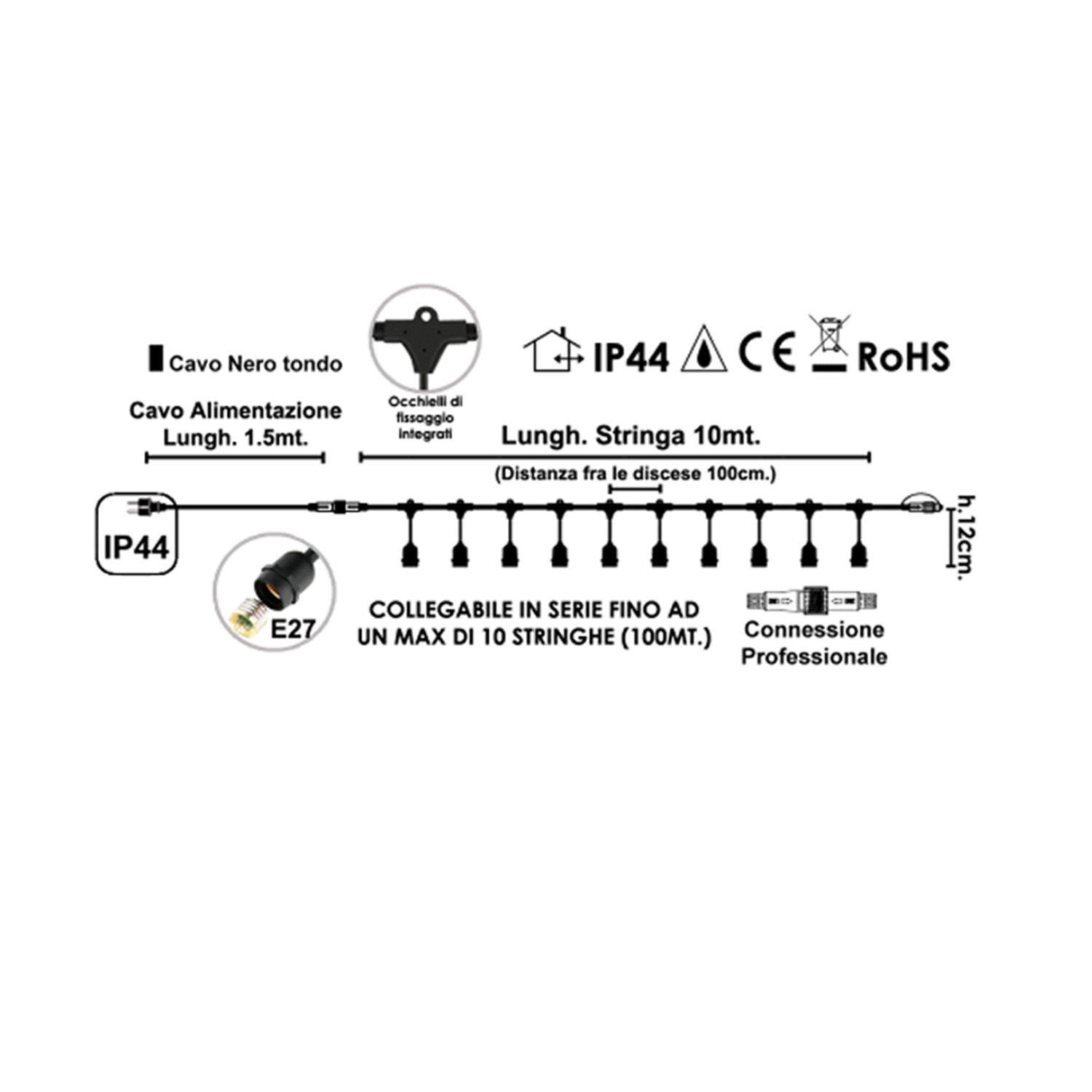 Stringa con 10 Portalampade E27 con occhielli di ancoraggio Lungh.10mt +1,5mt di Cavo con Spina schuko IP44 Potenza Max 10x10W/E27 (lampadine non incluse). Collegabile in serie fino a max 10 Stringhe (100mt) Cavo Nero Gommato Per uso Esterno ed Interno Tens.alim.: 220~240V- 50/60Hz